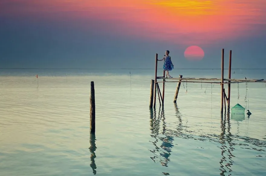 美丽的落日洒落在湖面上。