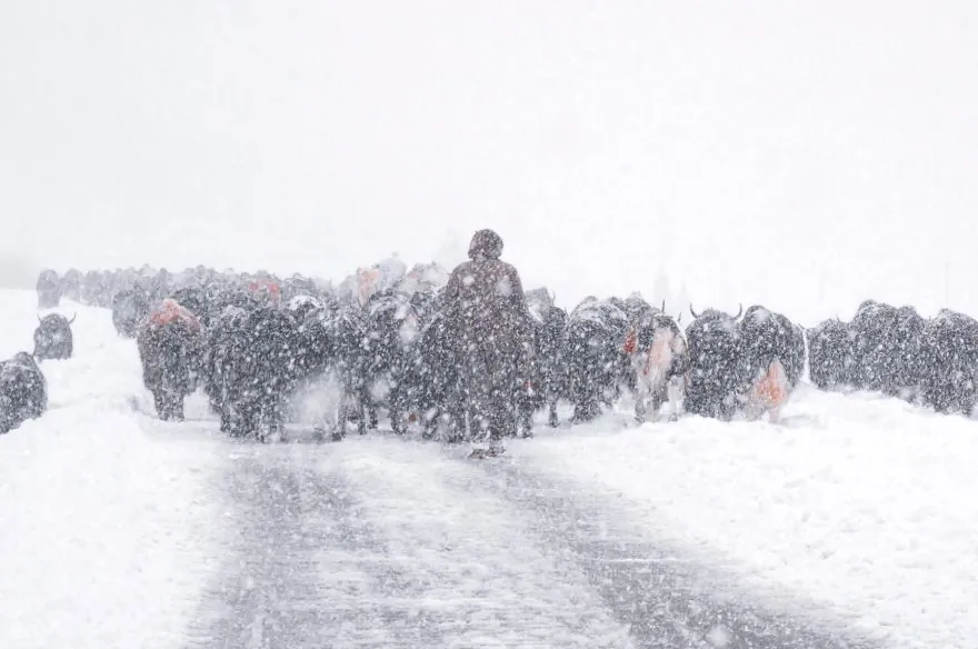 四月的理塘,一场三十年不遇的暴雪,一位牧民正在驱赶着自家的数百头牦牛迁徙牧场。