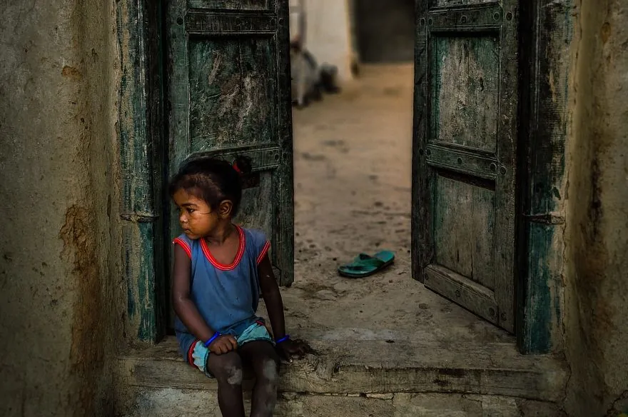 A child after waking up from her sleep. Waiting for her mother to come home from the fields.